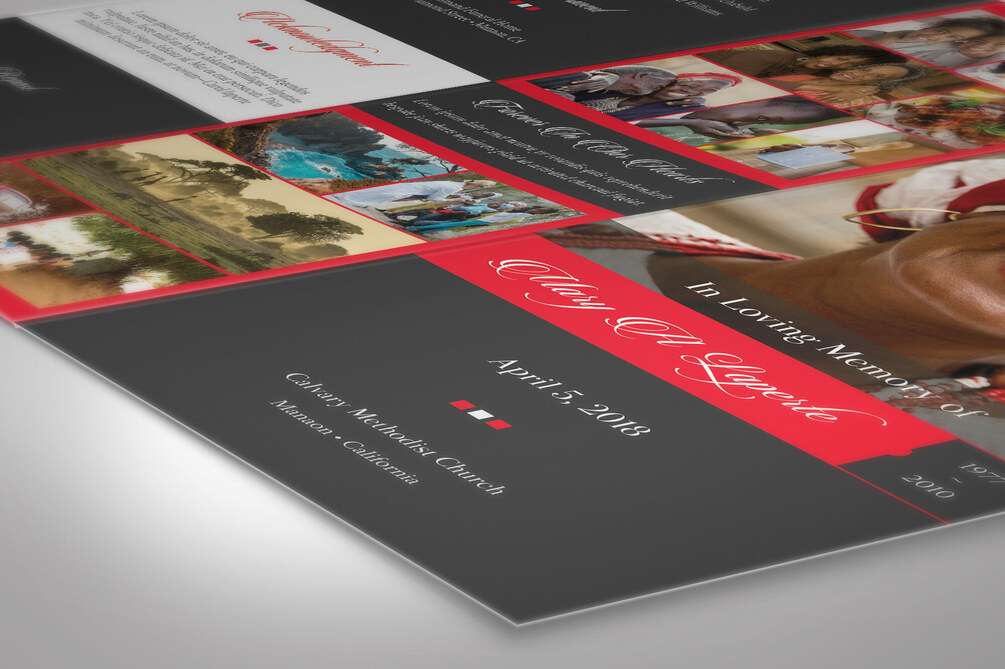 Remember Tri-fold Funeral Program Word Publisher Template, Tri-fold Size: 3.65”x8.5”, is designed for memorial or funeral services. The red and black color with beautiful typography makes this a great gift to remember your loved one. Utilize 15 photos to showcase your love ones personality, hobbies, friend and family. Customize this program to create a unique keepsake that keeps their memories alive..