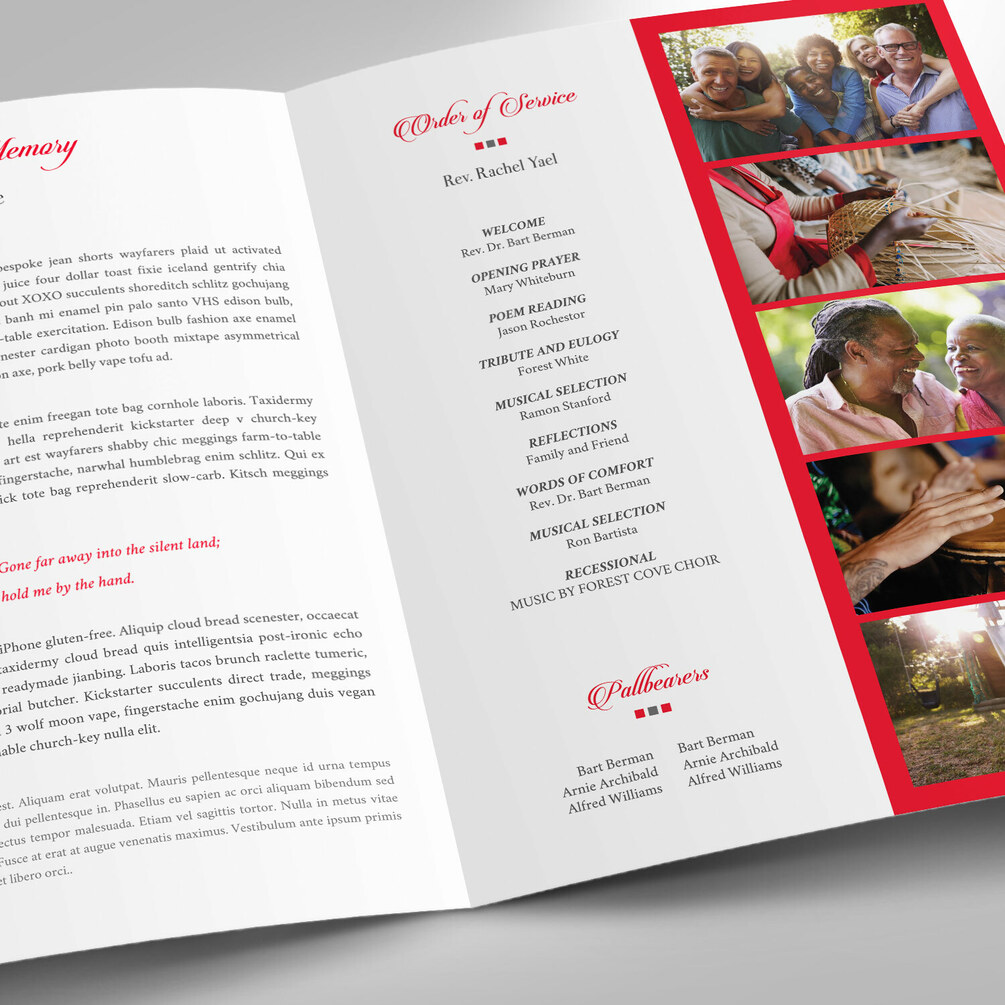 Remember Red Funeral Program Word Publisher Large Template, Bi-Fold Size: 8.5”x11”, is designed for memorial or funeral services. The red and black color with beautiful typography makes this a great gift to remember your loved one. Utilize 21 photos to showcase your love ones personality, hobbies, friend and family. Customize this program to create a unique keepsake that keeps the memories alive.